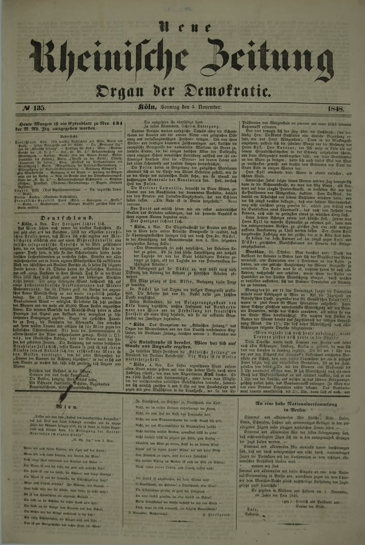 junho de 1848 e 9 de Maio de 1849. O jornal foi dirigido por K. Marx e F. Engels, sendo Marx o redactor-chefe. A Nova Gazeta Renana, apesar de todas as perseguições e obstáculos por parte da polícia, defendia corajosamente os interesses da democracia revolucionária, os interesses do proletariado. A expulsão de Marx da Prússia em Março de 1849 e as perseguições contra os outros redactores da Nova Gazeta Renana foram a causa da cessação da publicação do jornal. Foram editados apenas 6 números. Sua redação era composta por Karl Marx, Heinrich Bürgers, Ernst Dronke, Friedrich Engels, Georg Weerth, Ferdinand Wolff, Wilheim Wolff e, mais tarde, acrescida com a colaboração de Ferdinand Freiligrat.